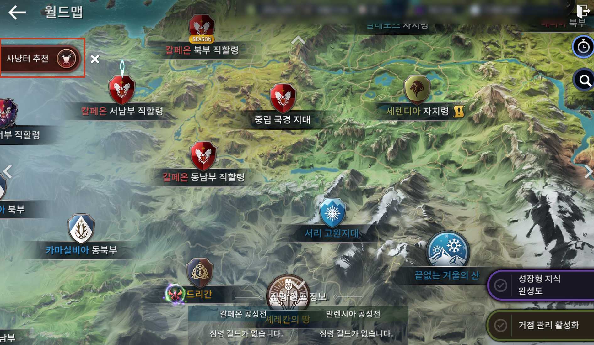 월드맵에서 '사냥터 추천' 버튼을 누르면