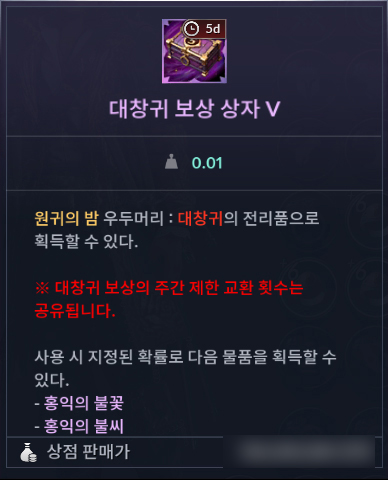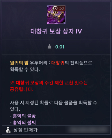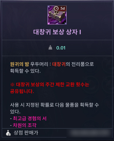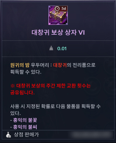ㆍ대창귀 보상 상자는 5일의 유효 기간을 가지고 있으며, 기간 만료 후 상점에 판매할 수 있습니다.