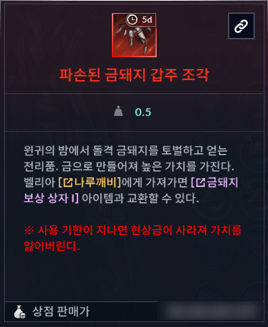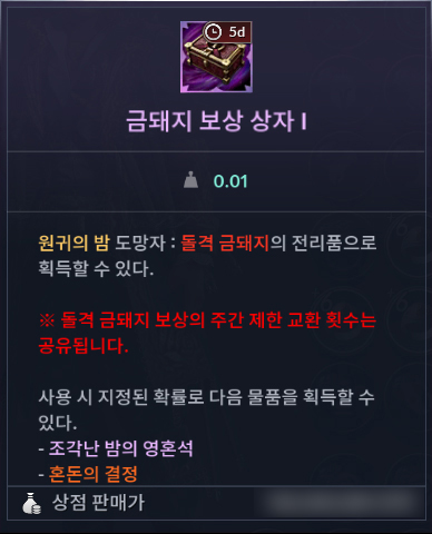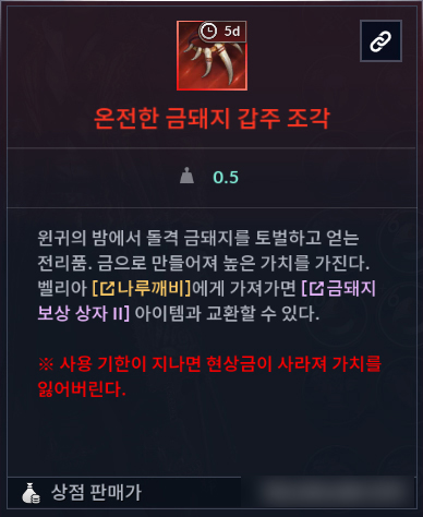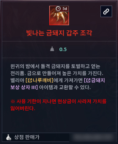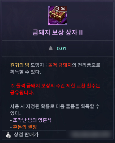 ㆍ금돼지 보상 상자는 5일의 유효 기간을 가지고 있으며, 기간 만료 후 상점에 판매할 수 있습니다.