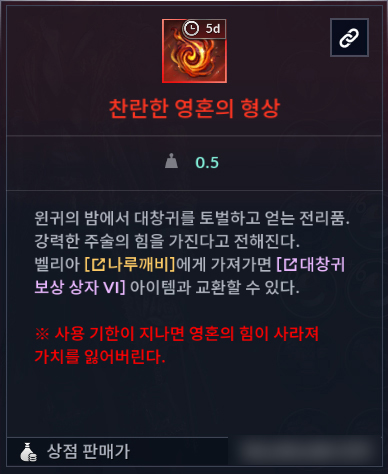 - 영혼의 형상은 획득한 후 5일 이내에 사용해야 하며, 기간 만료 후 상점에 판매할 수 있습니다.
