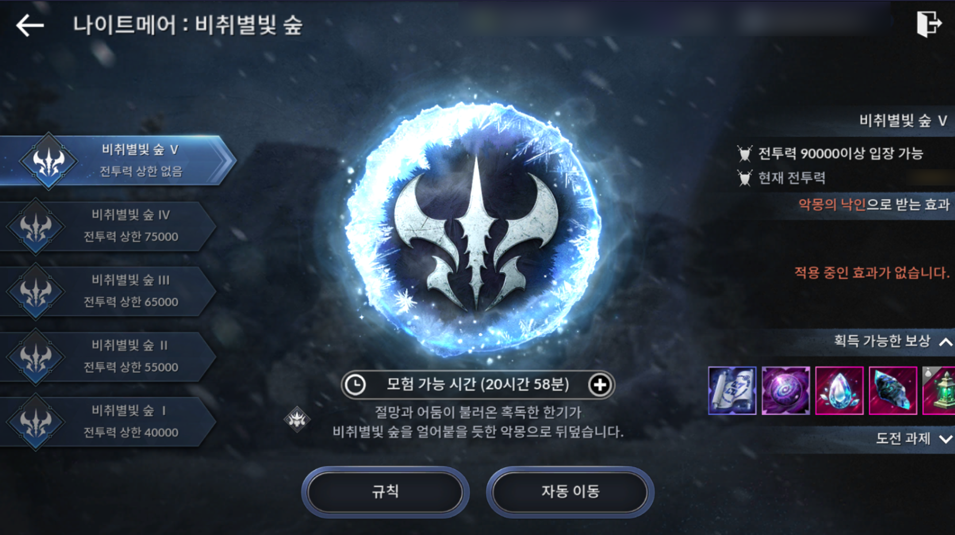 - 비취별빛 숲 I~IV난이도에서는 전투력 상한이 적용됩니니다.