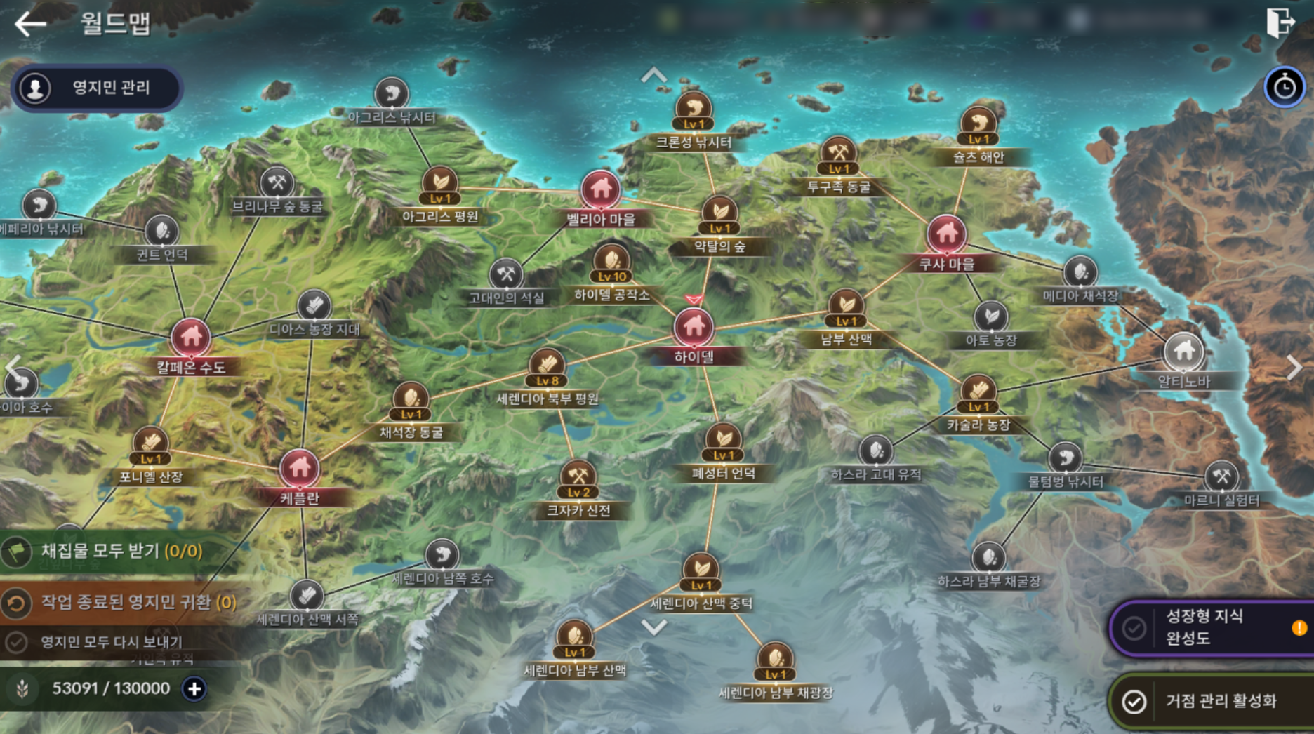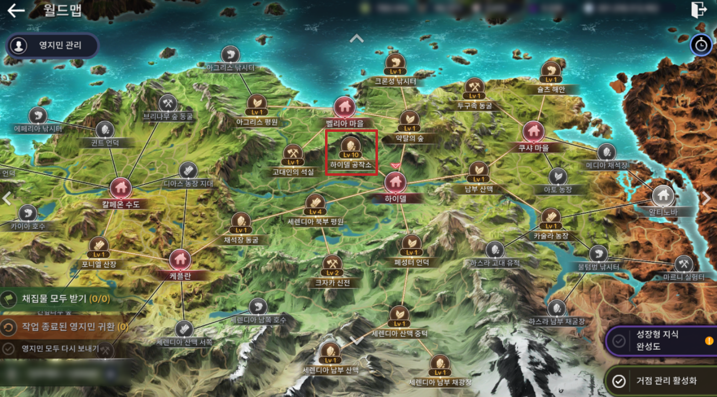 이 모든 과정에서는 영지 자원이 필요한데요, 거점 관리를 통해 영지 자원을 수집할 수 있습니다.