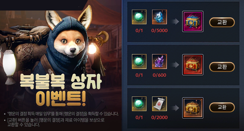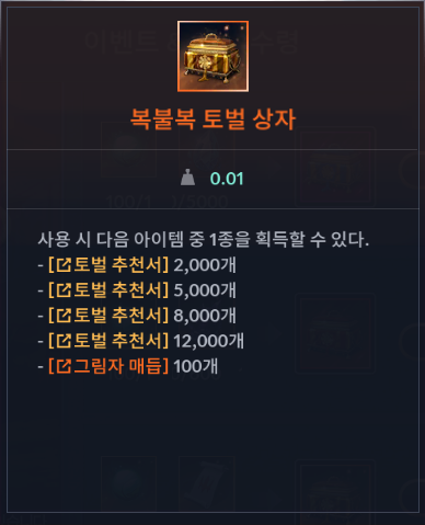 | 행운의 결정 1개 | 토벌 추천서 2,000개 | 복불복 토벌 상자 |
