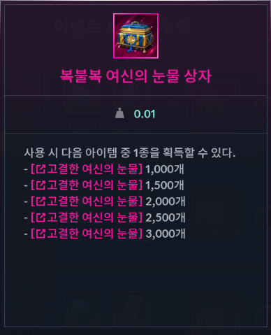 | 행운의 결정 1개 | 여신의 눈물 5,000개 | 복불복 여신의 눈물 상자 |