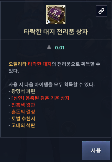 ㆍ획득한 봉인된 어둠의 기운은 [오딜리타 오드락시아] 지역의 벨로안 NPC에게 ‘타락한 대지 전리품 상자’로 주간 3회까지 교환할 수 있습니다.