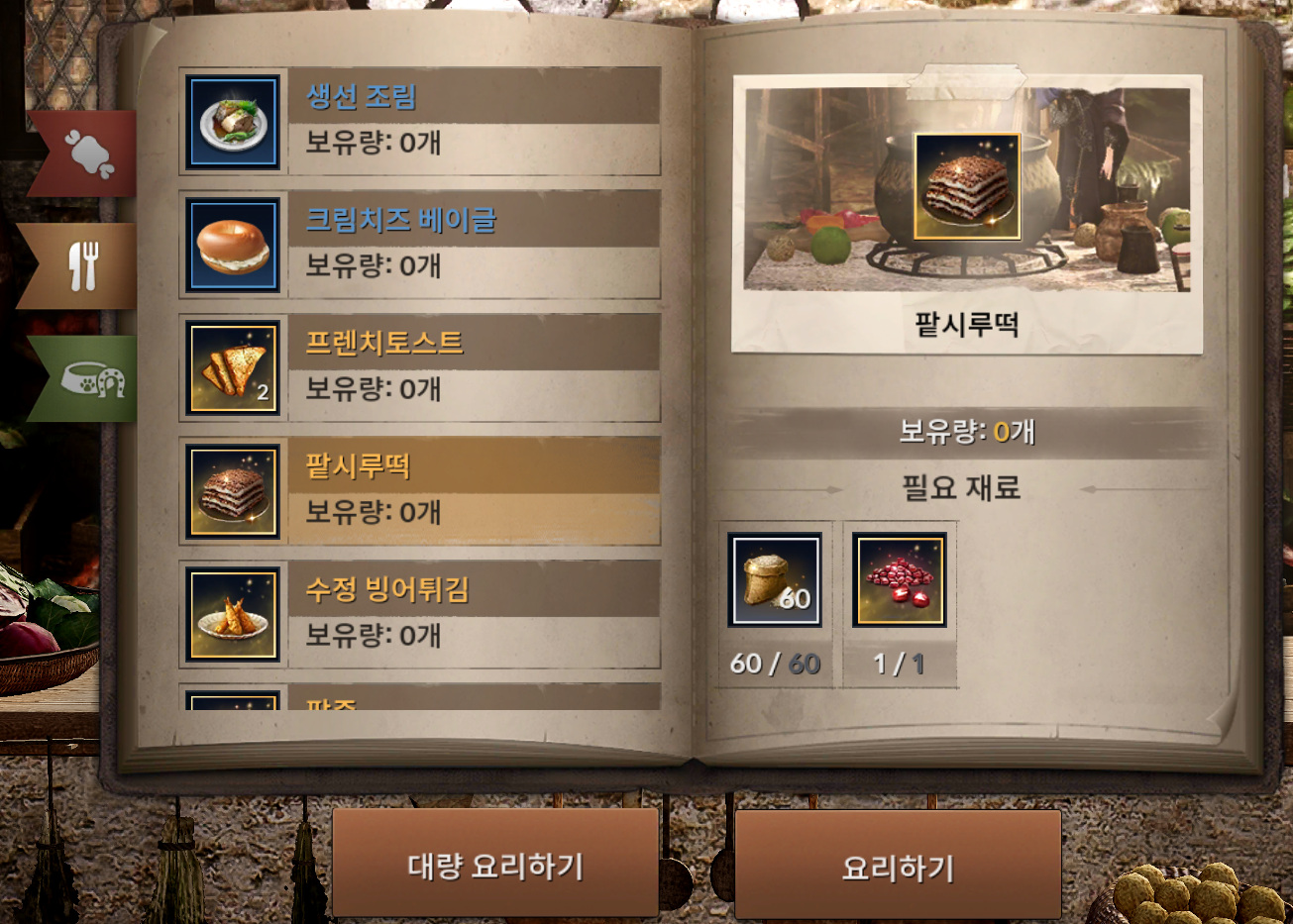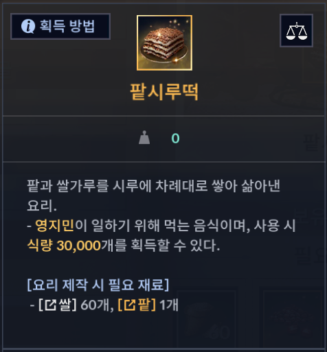 팥시루떡은 요리 레벨이 숙련 이상일 때, 쌀 60개와 팥 1개를 이용하여 제작할 수 있습니다.