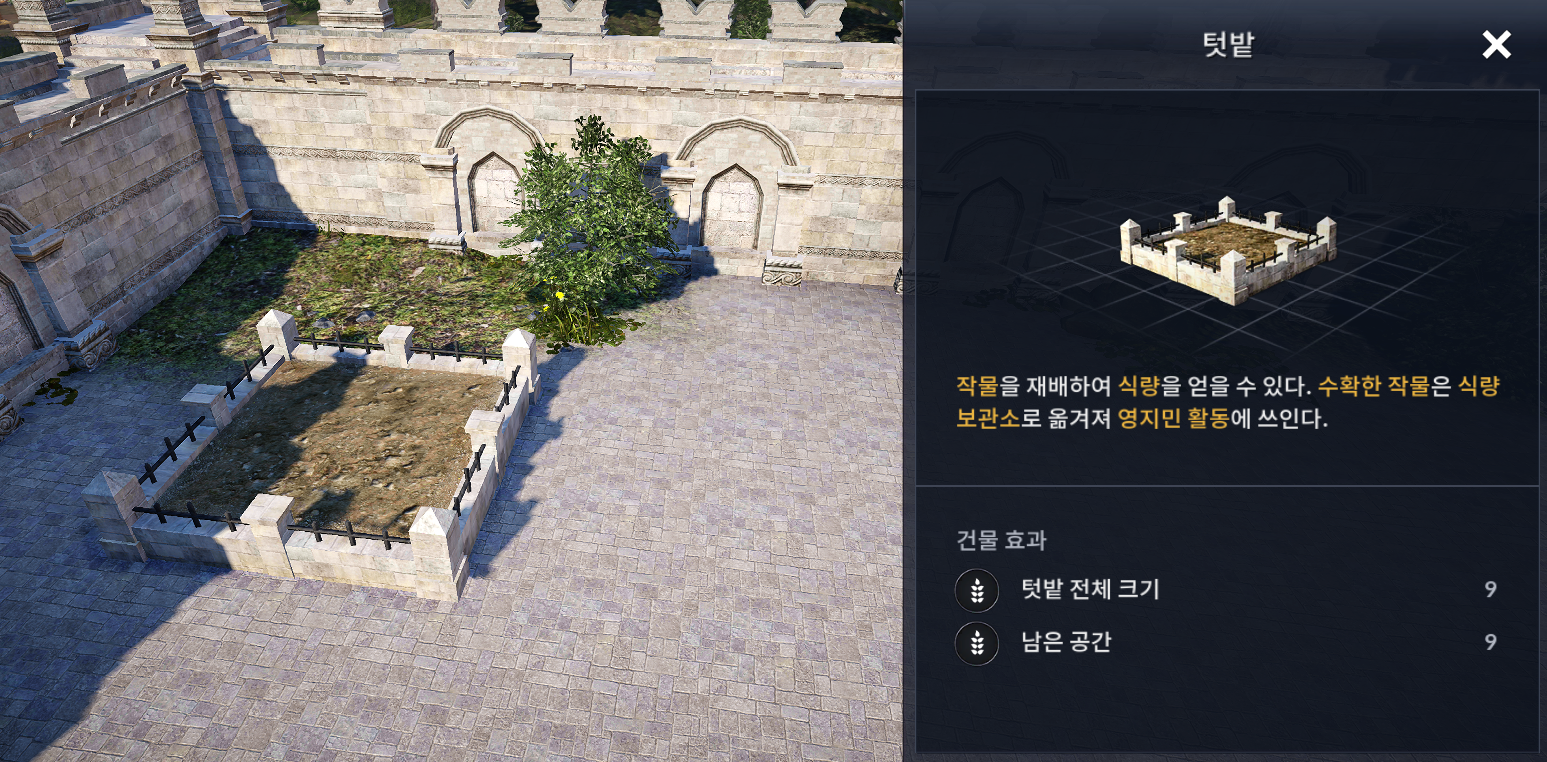 텃밭은 영지 내에 설치할 수 있는 설치물로 최대 4개까지 설치하여 작물을 심을 수 있습니다.