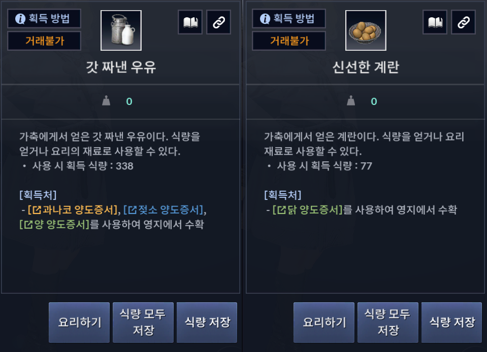 획득한 식량 아이템은 요리에 사용하거나, 식량으로 저장하여 사용할 수 있습니다.