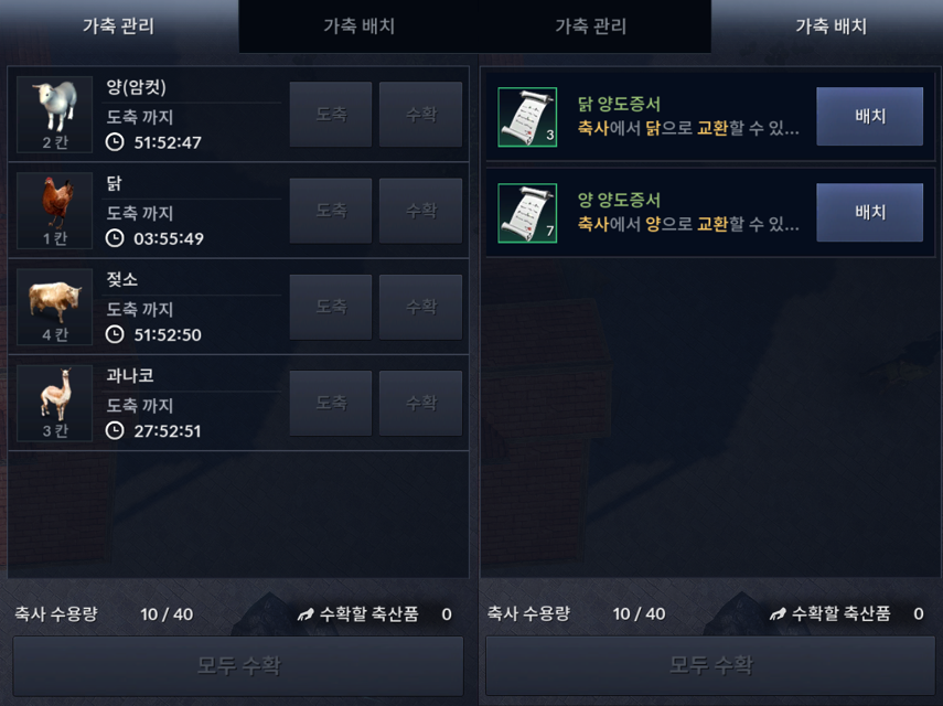 가축에 따라 자라는 속도가 다르며, 수확을 통해 획득할 수 있는 식량 아이템이 달라집니다.