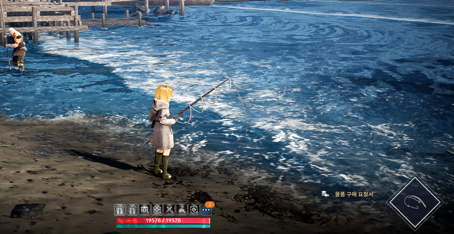 물가에 가까이가면 캐릭터가 낚싯대를 들고, 버튼을 눌러 낚시를 할 수 있습니다.