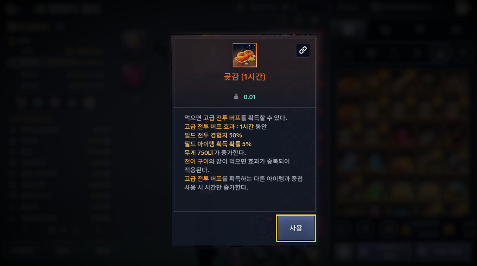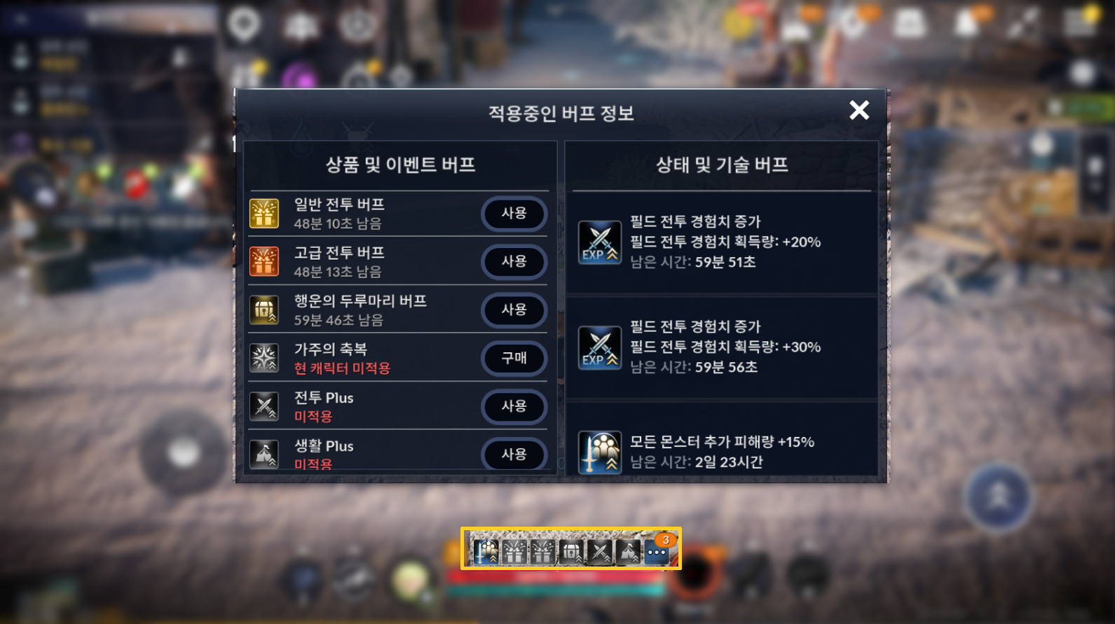 | 고급 전투 버프 | ㆍ필드 전투 경험치 증가 50% ㆍ필드 아이템 획득 확률 증가 5% ㆍ무게 증가 750LT |