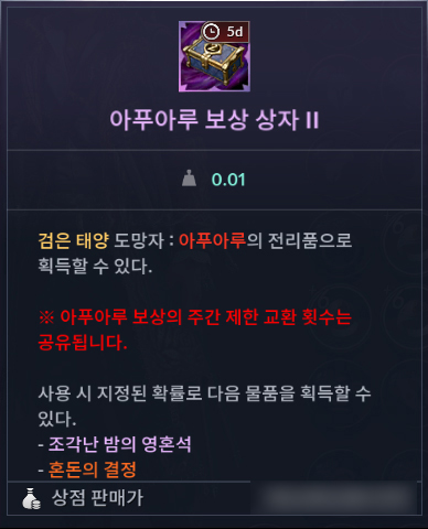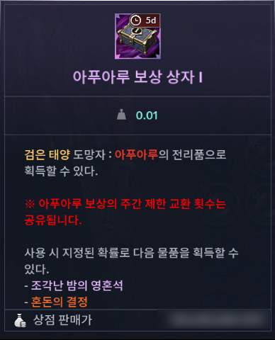 ㆍ아푸아루 보상 상자는 획득 한 후 5일 이내에 사용해야하며, 기간 만료 후 상점에 판매할 수 있습니다.