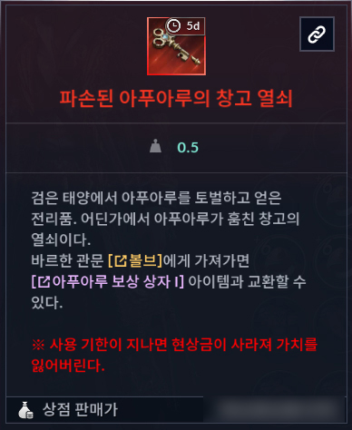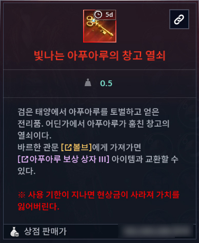 ㆍ아푸아루 창고 열쇠는 5일의 유효 기간을 가지고 있으며, 기간 만료 후 상점에 판매할 수 있습니다.