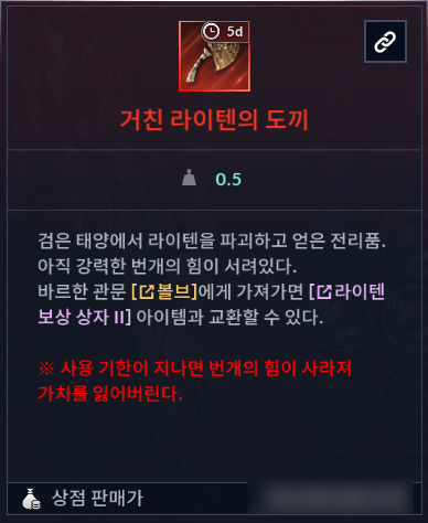 - 라이텐의 도끼는 바르한 관문의 ‘볼브 NPC’에게 라이텐 보상 상자 I~VI로 교환할 수 있습니다.