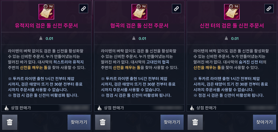 ㆍ ‘검은 돌 신전 주문서’는 검은 돌 신전을 봉헌할 수 있게 활성화할 수 있는 아이템입니다.